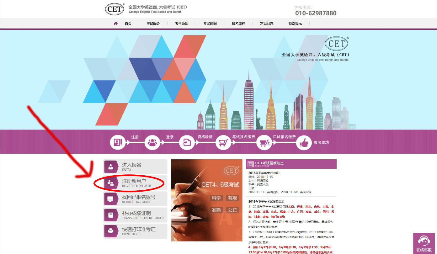 http://cet-bm.neea.edu.cn/登录网站,没有ETEST通行证(如果有NCRE、MHK等可以通用),需要先注册