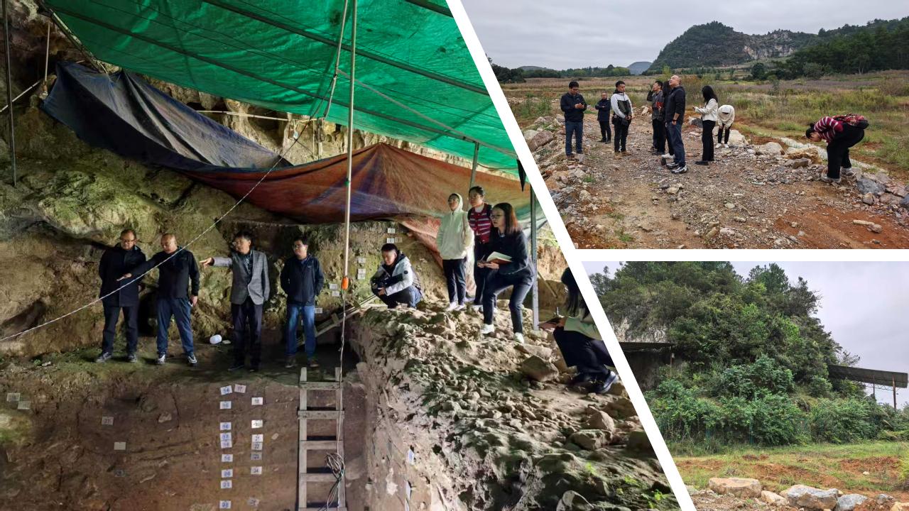 会后,与会师生赴贵阳市贵安新区招果洞、牛坡洞两个重要考古遗址开展现场考察。考察团队首先抵达招果洞遗址,这座入选2020 年度全国十大考古发现的洞穴遗址,正以 4.4 万年的连续文化堆积书写着西南地区古人类的生存史诗。在遗址核心发掘区,张兴龙研究馆员结合最新考古研究进展做了详细讲解,他特别指出,遗址中持续稳定的黑色燧石石器工业,为现代人迁徙“南方路线” 理论提供了关键佐证,目前正在推进的古代DNA 与古环境研究更有望揭开人类物种连续性的未解之谜。随后,考查组前往2016年度的“全国十大考古新发现”牛坡洞遗址。这座由 A、B、C 三洞组成的洞穴遗址群,以从旧石器时代晚期延续至春秋战国的 27 层文化堆积,构建起黔中地区1.5万年以来的首个史前文化序列。张兴龙研究馆员指着距今万年左右的蹲踞葬遗迹介绍:“牛坡洞遗址和招果洞遗址发现的距今超过1万年的墓葬,同为华南地区最早的人类埋葬行为之一,为屈肢葬俗流变研究提供了重要线索。”